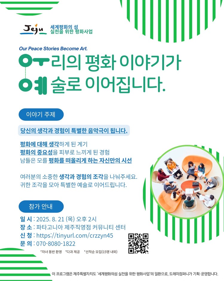 이 프로그램은 제주특별자치도 ‘세계평화의섬 실천을 위한 평화사업’의 일환으로 도레미컴퍼니가 기획·운영합니다.