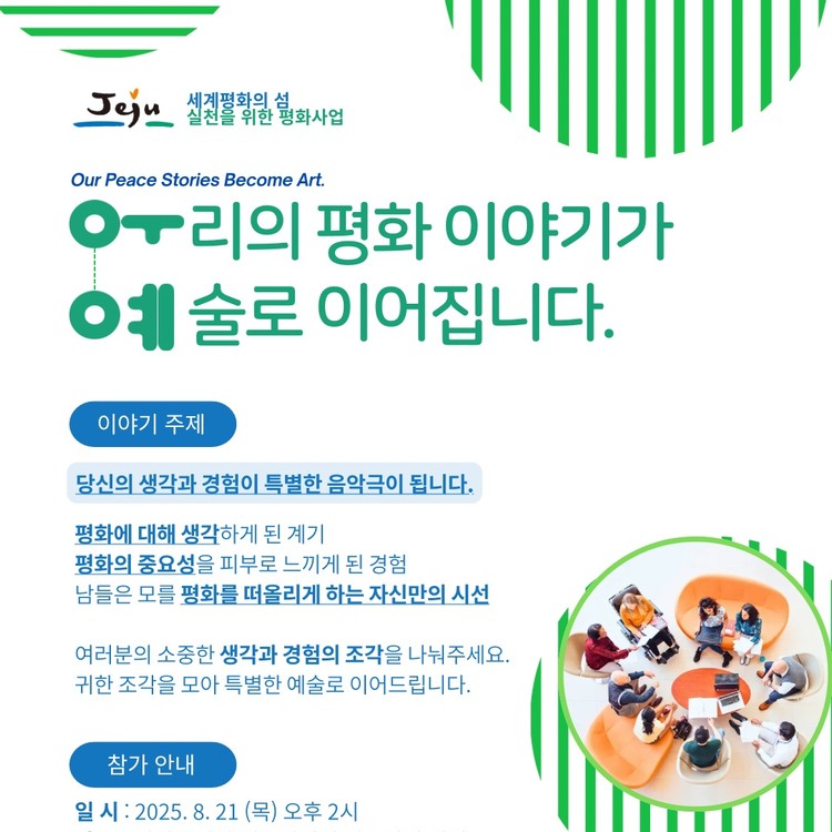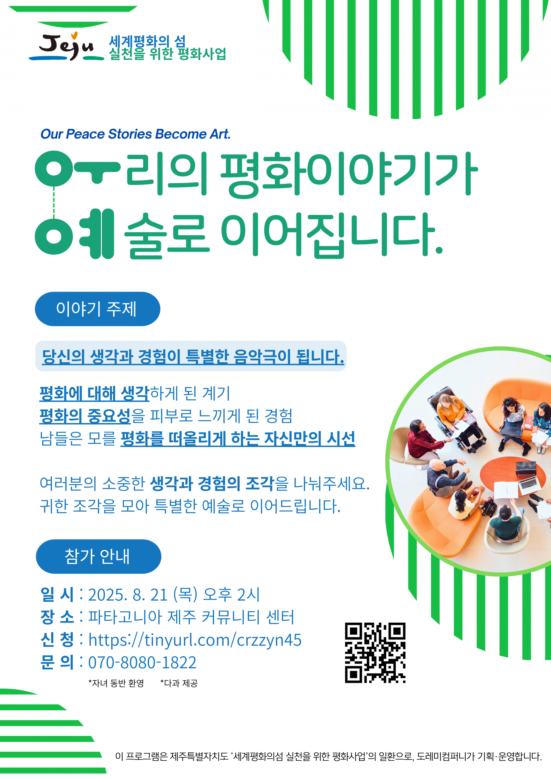 이 프로그램은 제주특별자치도 ‘세계평화의섬 실천을 위한 평화사업’의 일환으로 도레미컴퍼니가 기획·운영합니다.